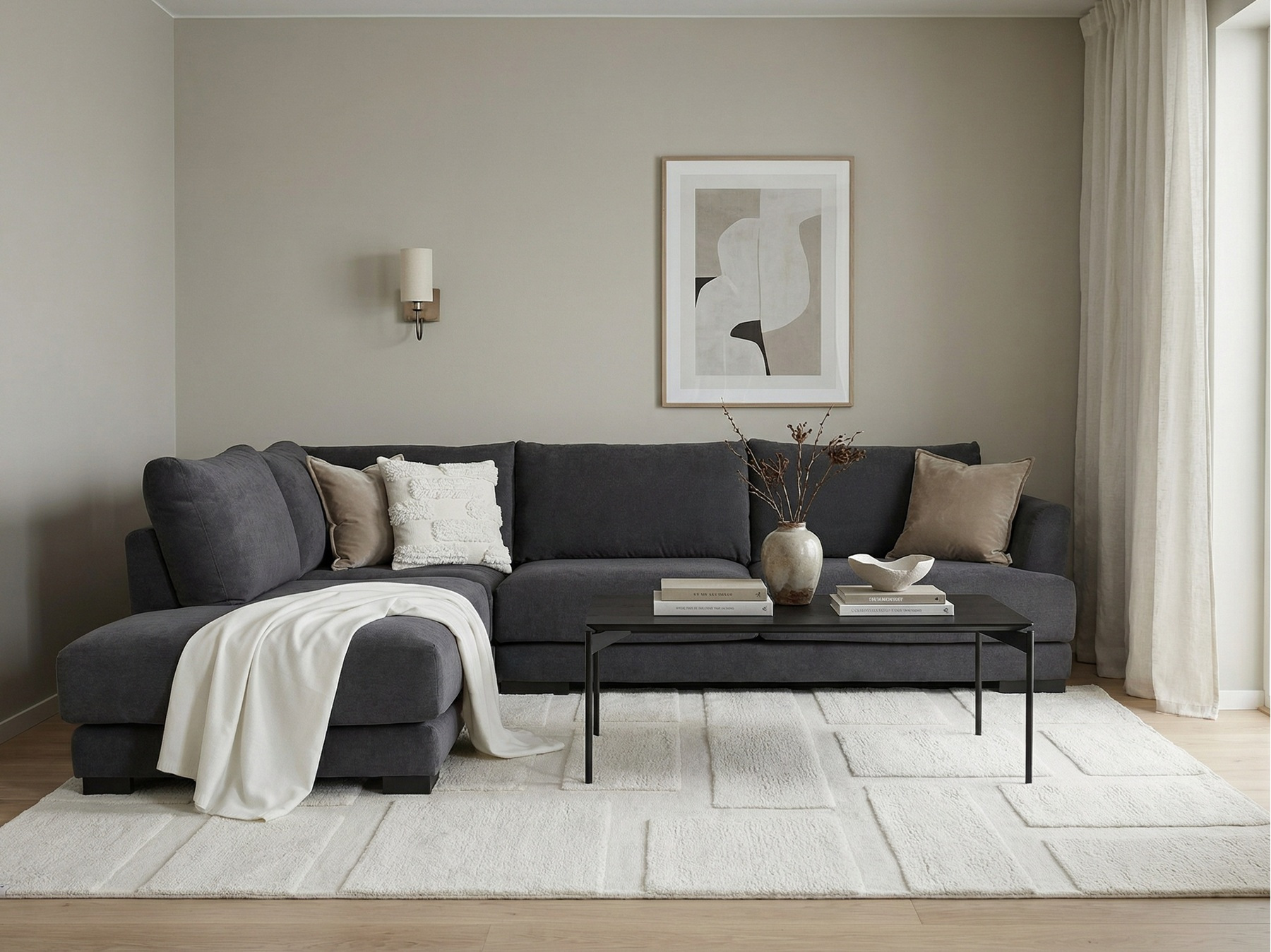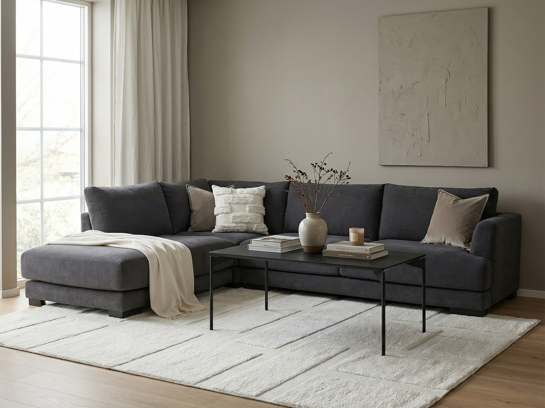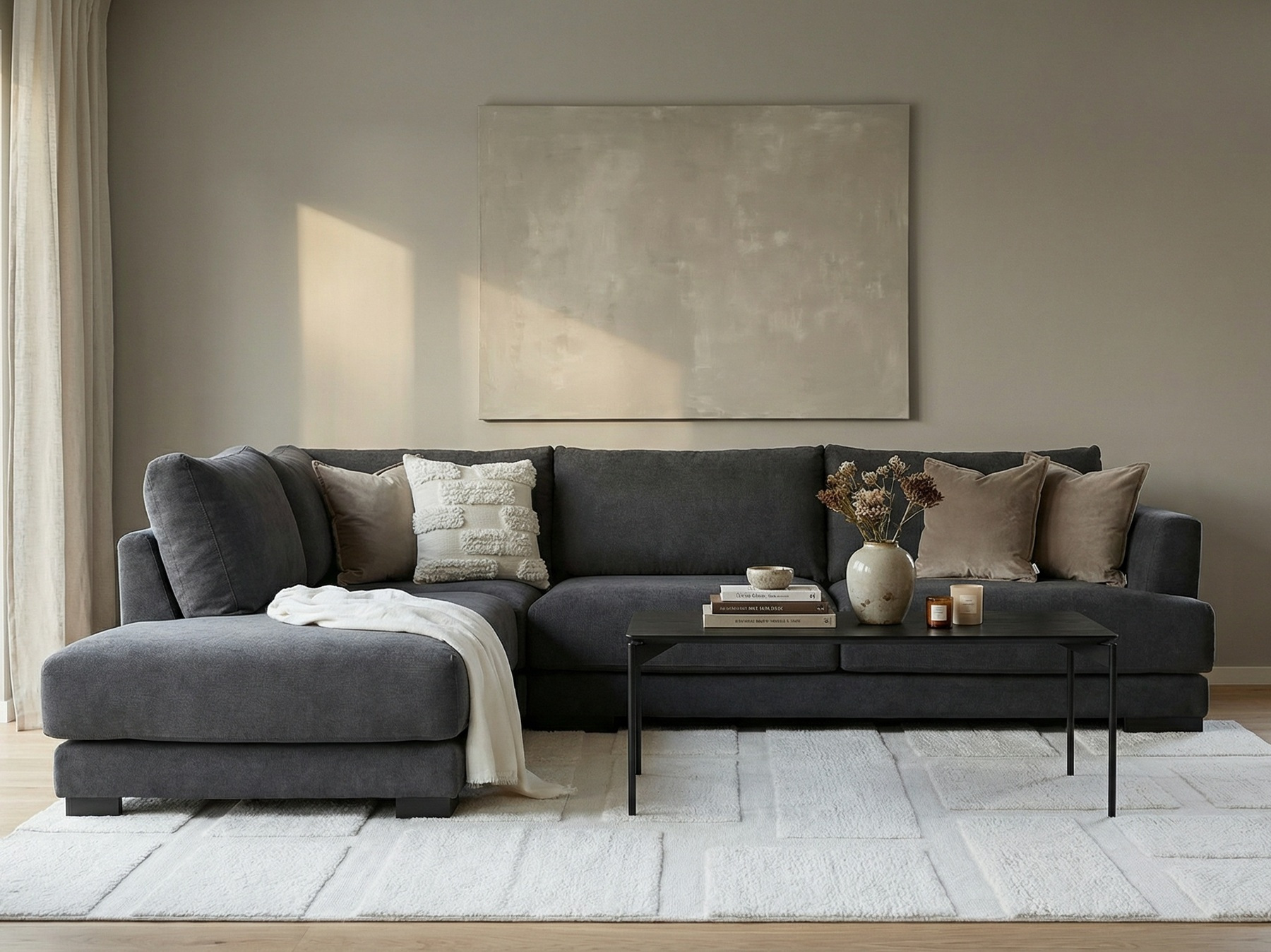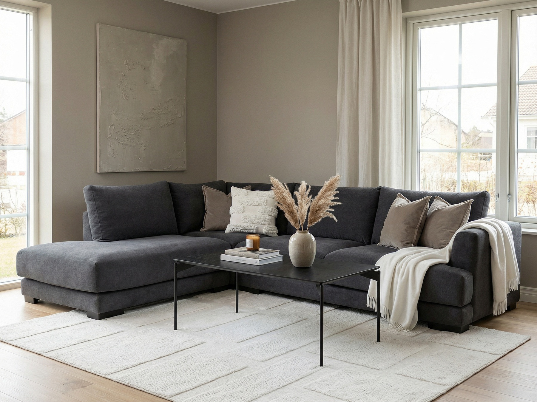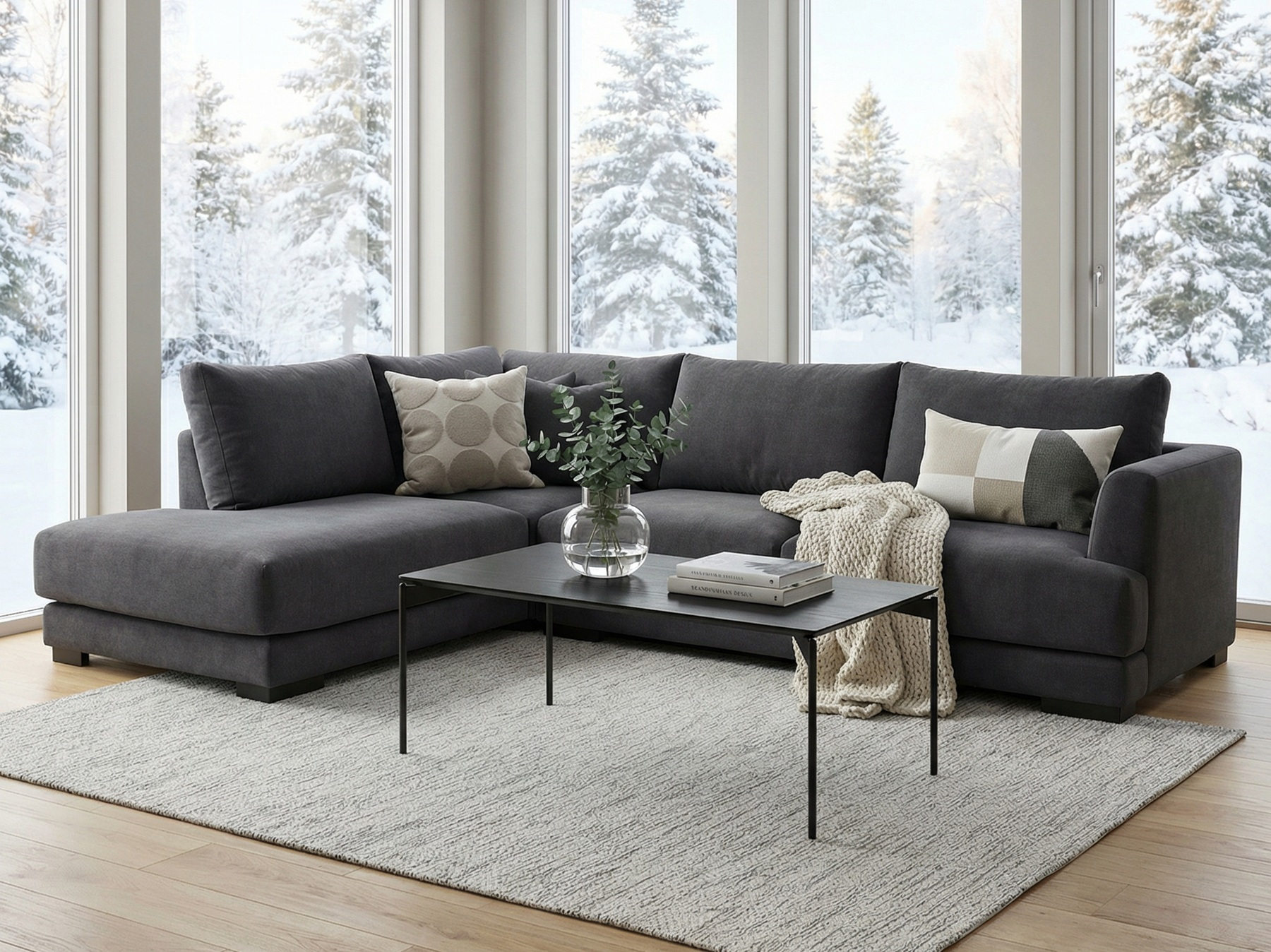 På nätet kan du beställa Andango Hörnsoffa i vårt mest populära tyg: Mine 4465 Mörkgrå och med svarta ben.