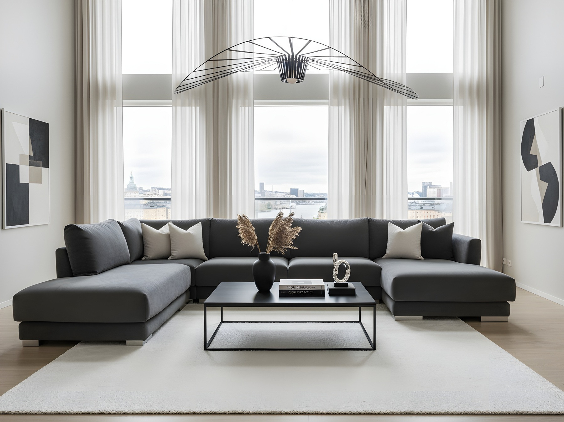 Soffan är byggbar och kan beställas med olika moduler. Denna u-soffa kommer i 4 st sektioner för att kunna gå in i trapphus och hissar utan problem. Finns i flera hundra olika tyger/färger samt i skinn. Välj bland flera olika färger på benen och olika benhöjder (5cm och 8cm och 13cm).