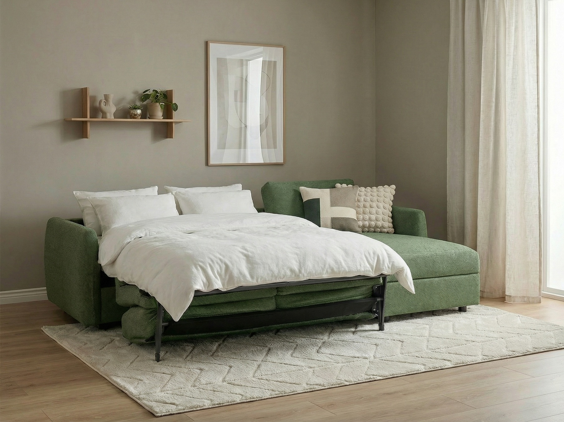 Du bäddar enkelt ut soffan genom ett enkelt handgrepp, inga plåmåer att plocka bort då sits och ryggdynor sitter fast i stommen. Hela divandelen har en rymlig förvaring, perfekt för bäddmadrass, täcken, kuddar och lakan. Man lyfter bara enkelt upp divandynan.