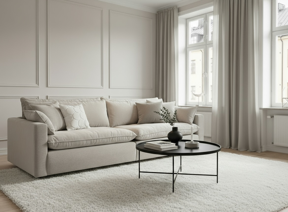 På nätet kan du beställa Naomi 3,5-sits soffa i bildens mjuka och lättskötta tyg: More. (Prisgrupp 4). Välj bland flera olika färger.