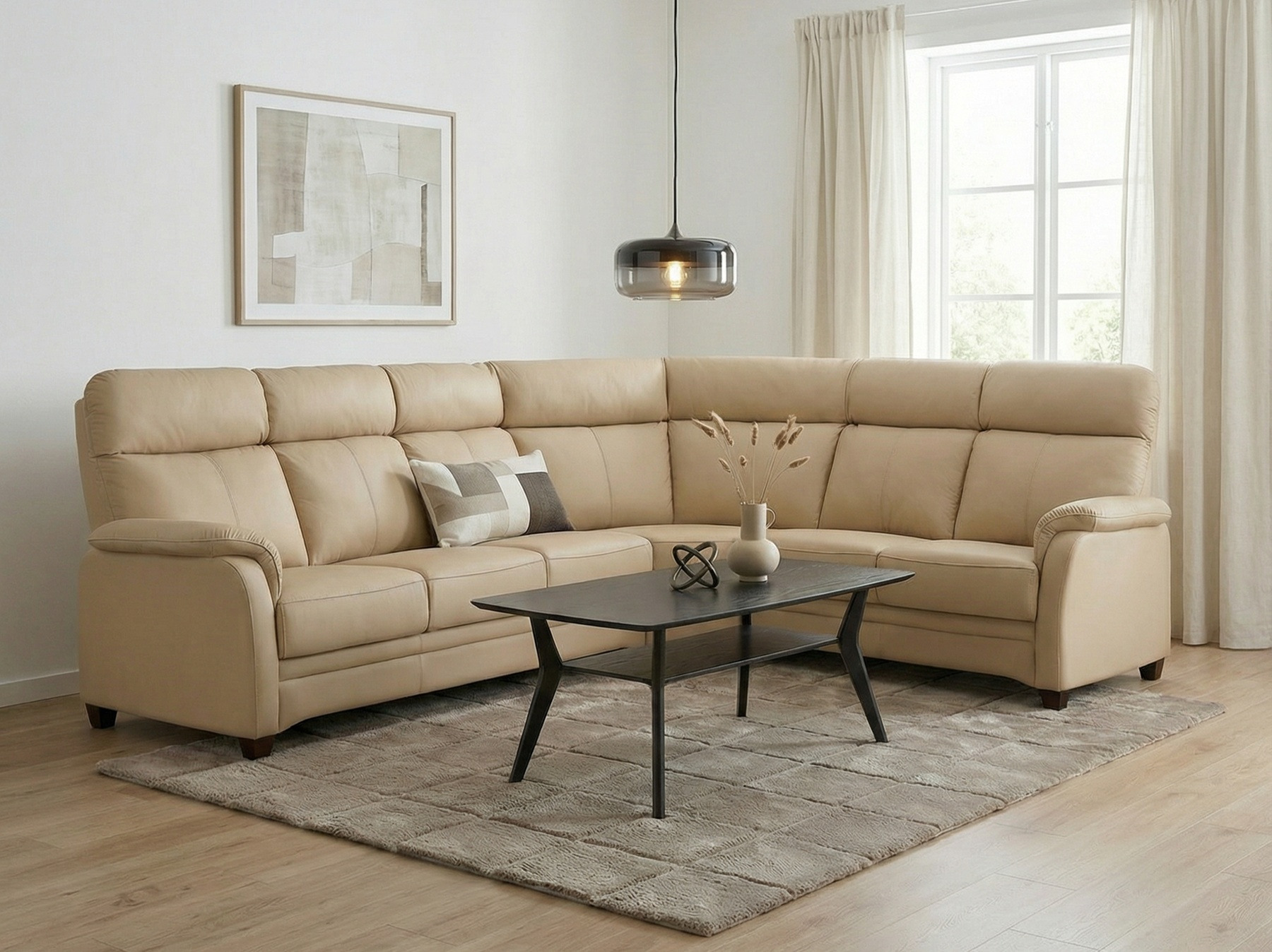 Väldigt komfortabel hörnsoffa i skinn med fastsydda sitt- och ryggdynor. Bra stöd för svanken, hög rygg och skönt stöd för nacken ger absolut bästa sittkomfort. Sittdynor i kallskum (35kg) av högsta kvalité. Stomme i massivt trä och björkplywood.