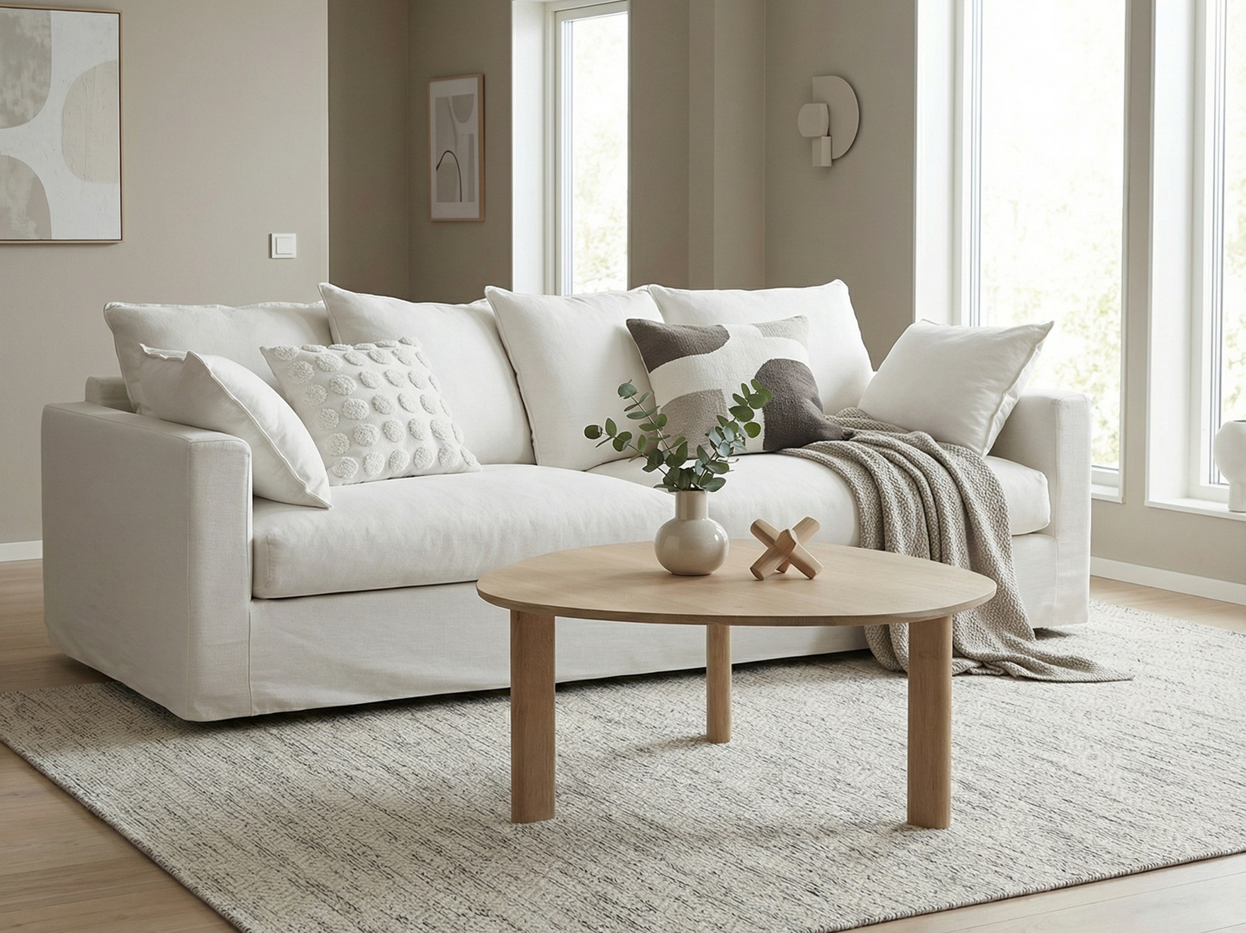 På nätet kan du beställa Sandy 3-sits i bildens populära tyg: Bronco 5208 Vit. Martindale: 80 000. Ljuskänslighet: 5-6. Pilling: 5 (ingen noppning). Specifikation: 38% Polyester, 31% Bomull, 21% Viscos, 10% Linne.