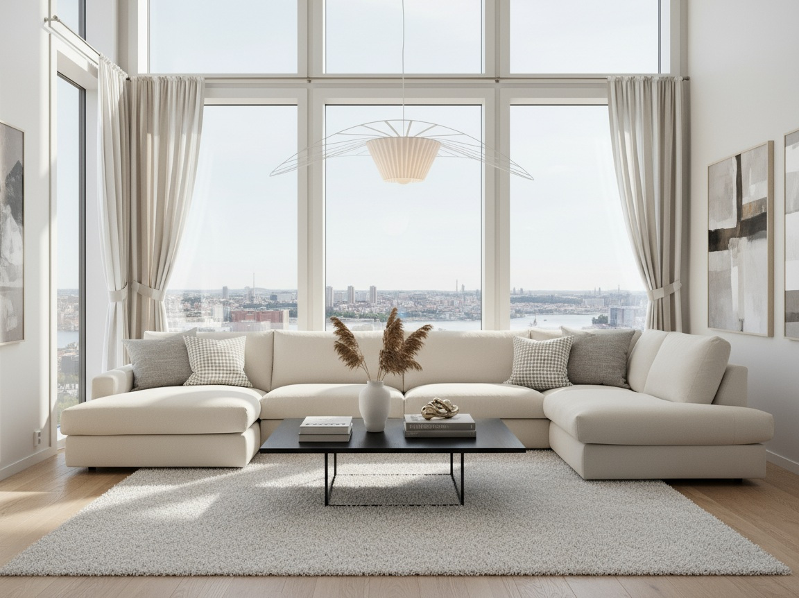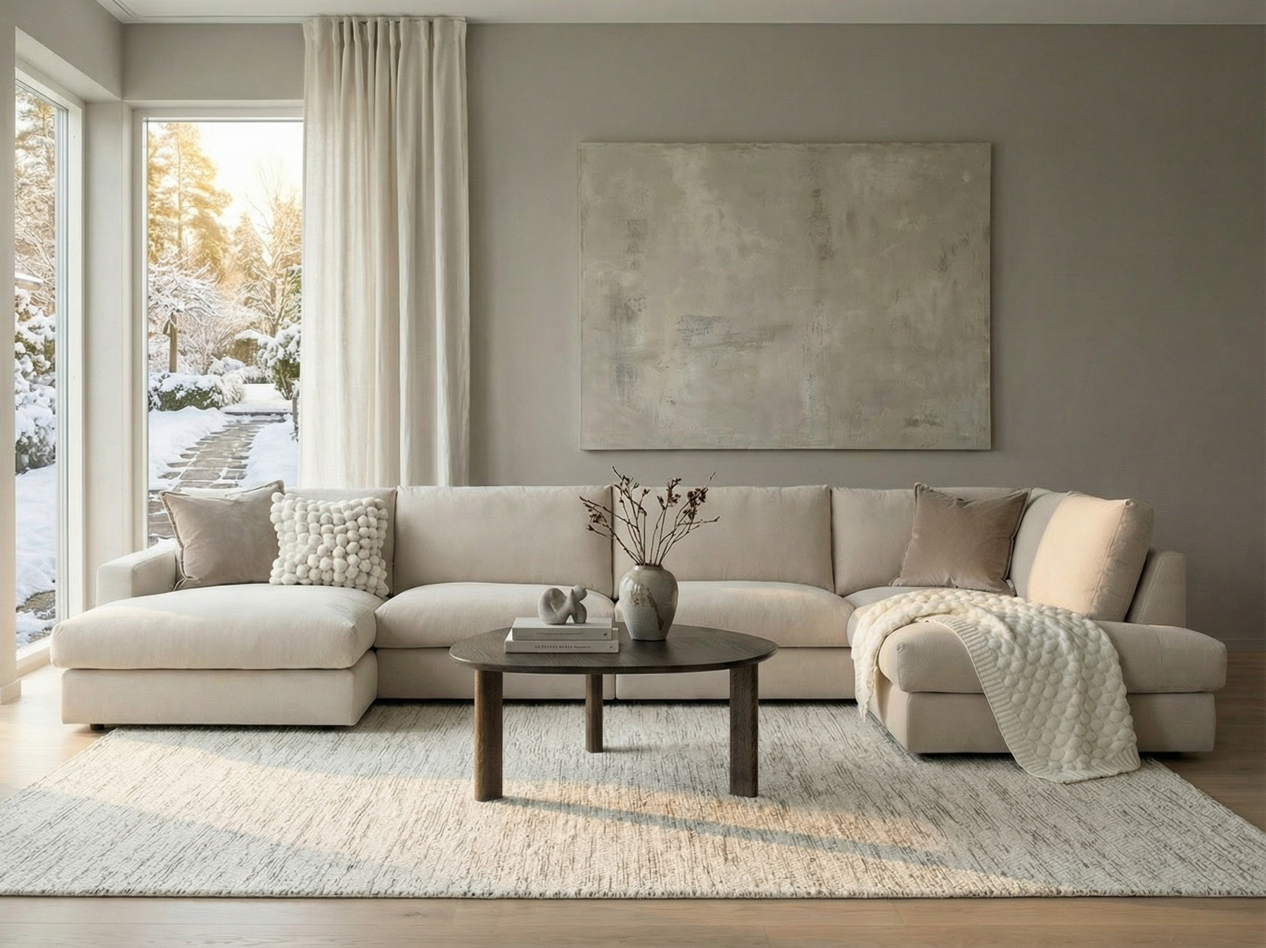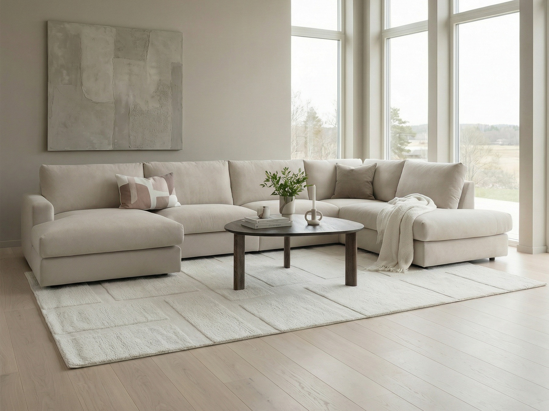 På nätet kan du beställa Stockholm U-soffa (408x238x168cm) i bildens grå Caleido tyg eller i tyget: Yedi Vit.