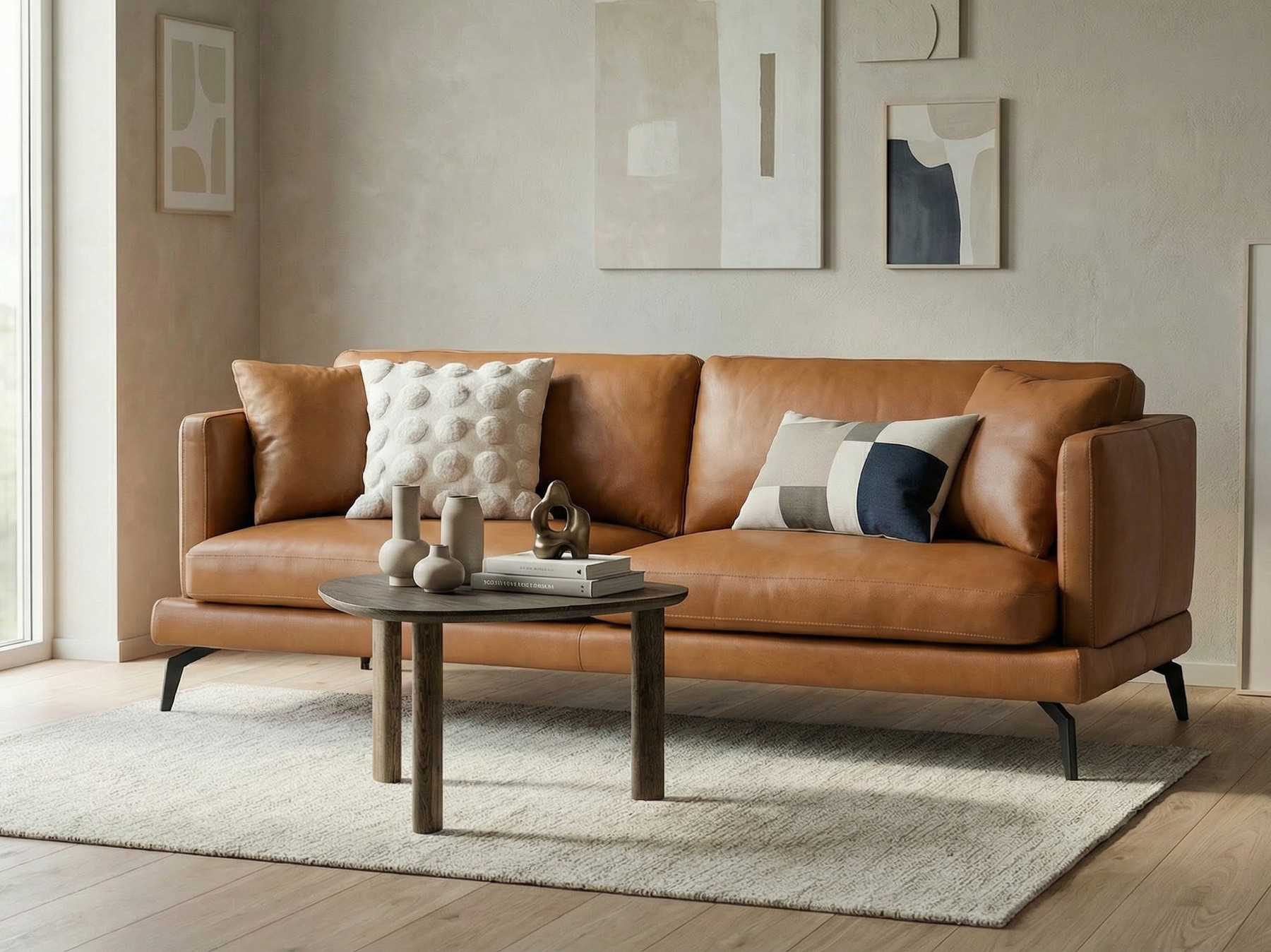 På nätet kan du beställa Time 3,5-sits soffa i bildens lyxiga skinn: Erlangen Brandy och med svarta metallben.